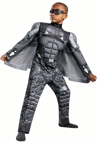 Includes jumpsuit with muscles, attached fabric wings, goggles.